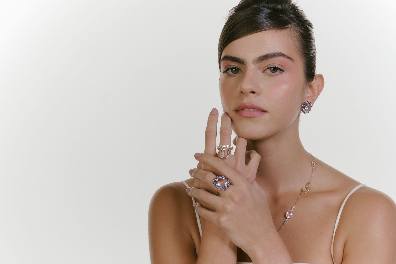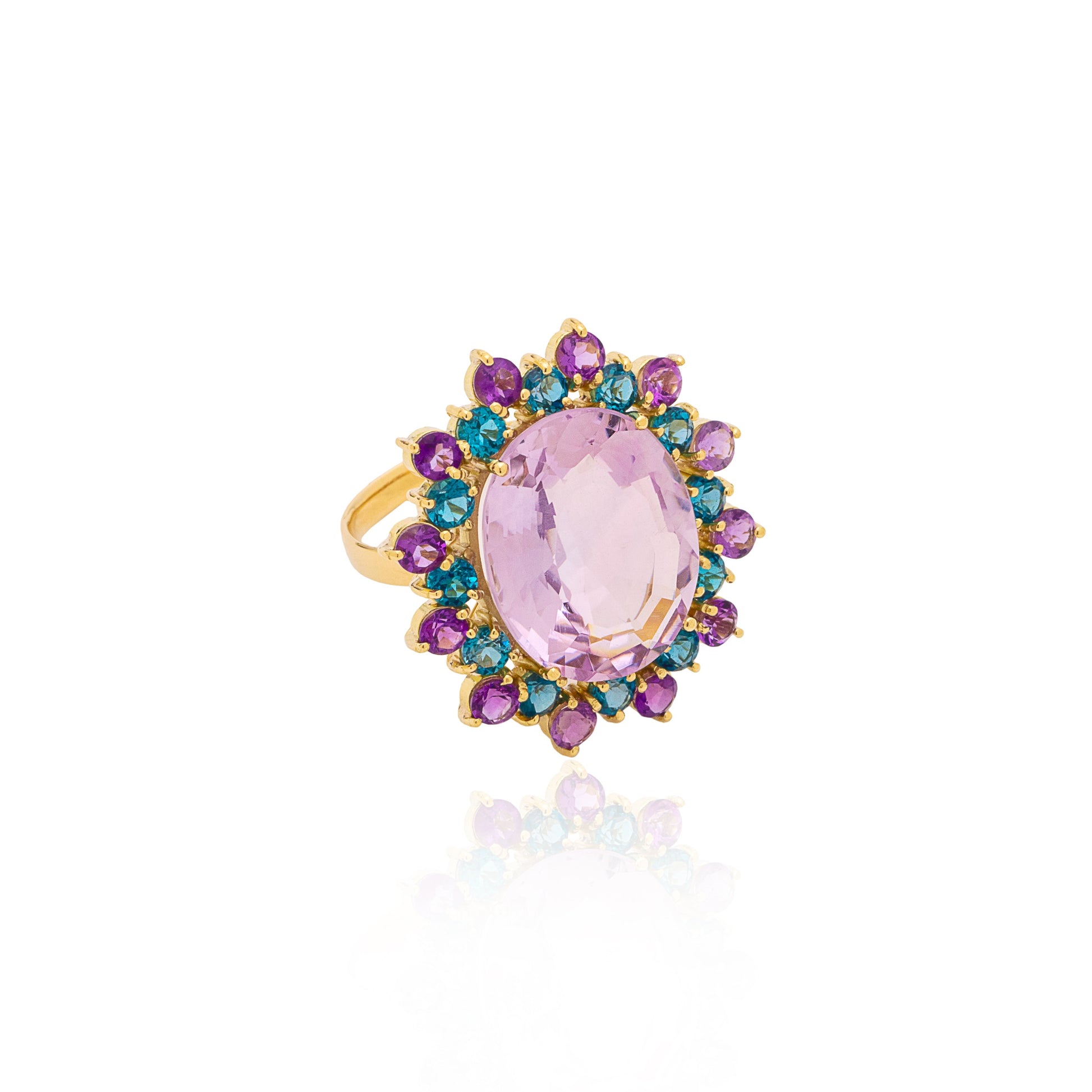O Anel Florescer é uma joia realçada através de uma ametista central adornada com topázio london em ouro amarelo.