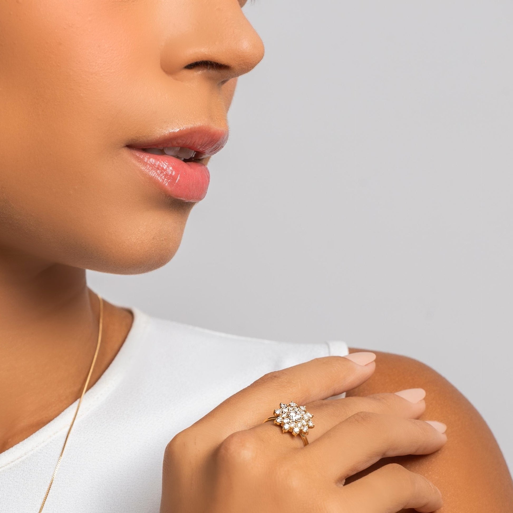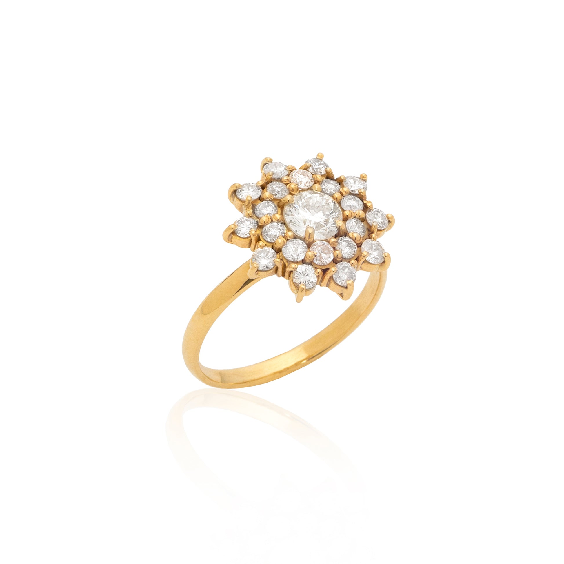 O Anel Essência é uma joia especial em ouro branco, com um diamante central (0,70 ct) e detalhes menores em diamantes (0,49 ct) simbolizando a essência viva de um vinho único.