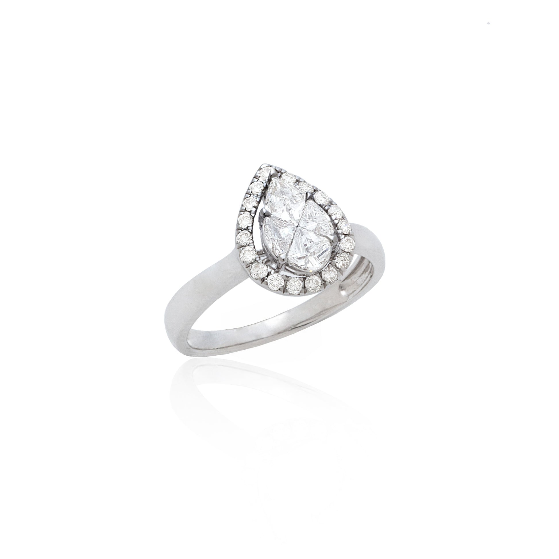 O Anel Reflexo é um design de gota ilusion de diamantes (0,84 ct) em Ouro Branco.