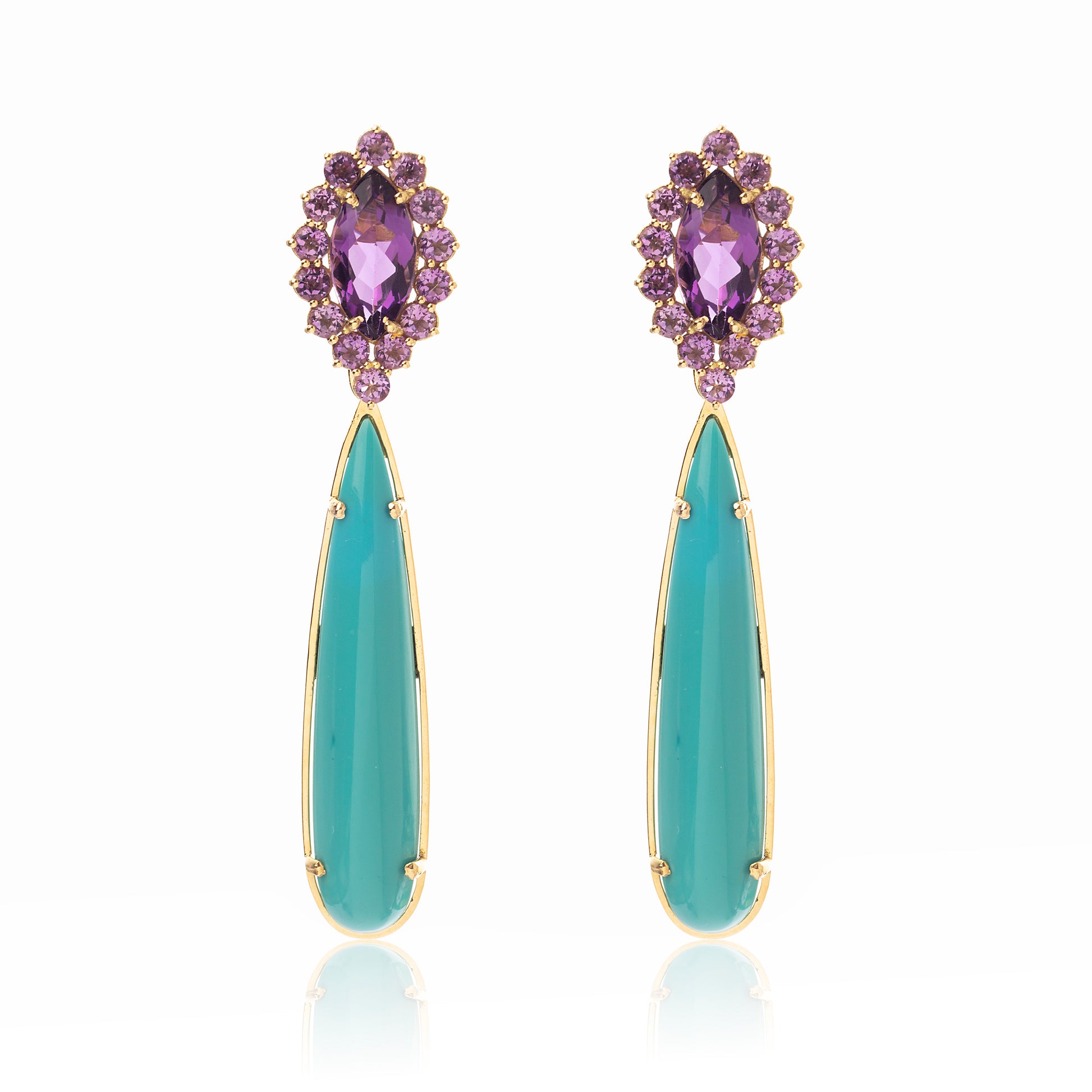 Brinco Ancara em Ouro Amarelo com Turquesa 27,15ct e Ametista 8,37ct — uma combinação exuberante que destaca personalidade e sofisticação. As pedras, em contraste perfeito, criam um visual vibrante e ao mesmo tempo elegante.