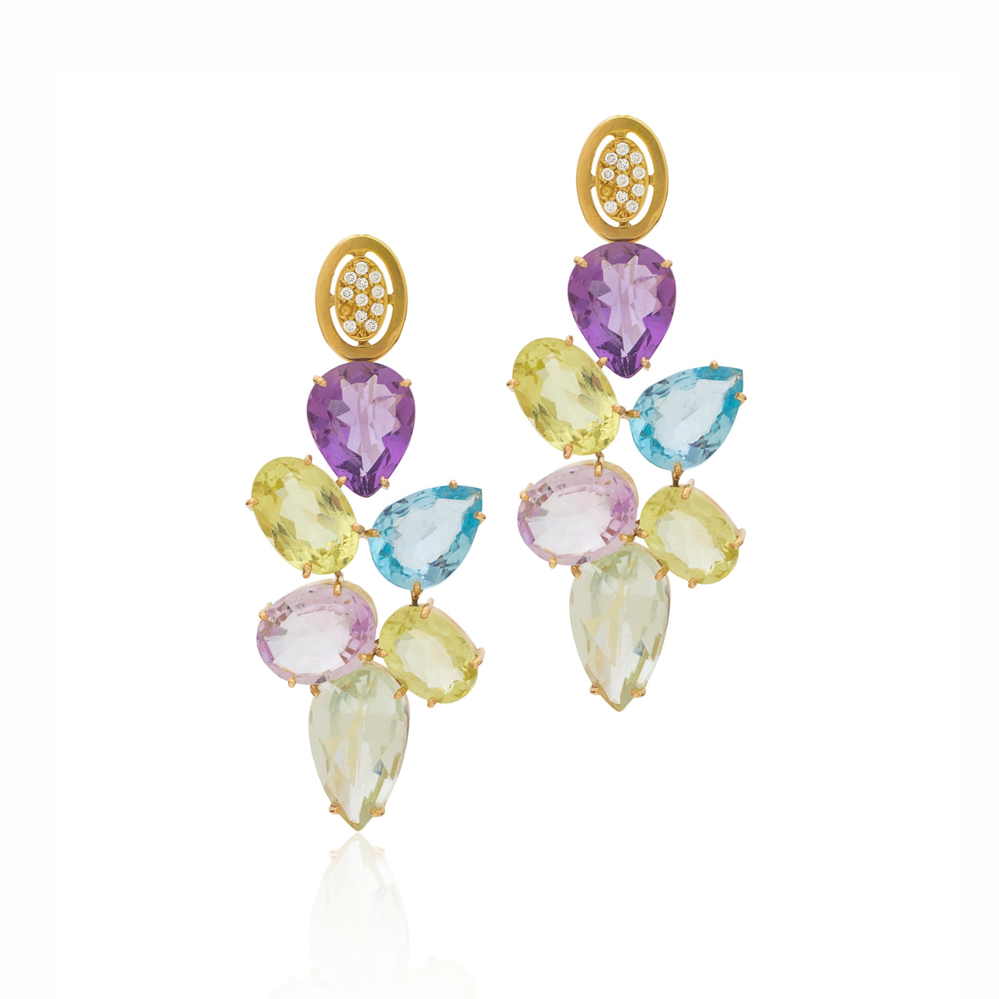 O Brinco Elos é um design exclusivo e colorido com ametista, topázio azul, prasiolita e detalhes de diamantes (0,24 ct), produzido em ouro amarelo.