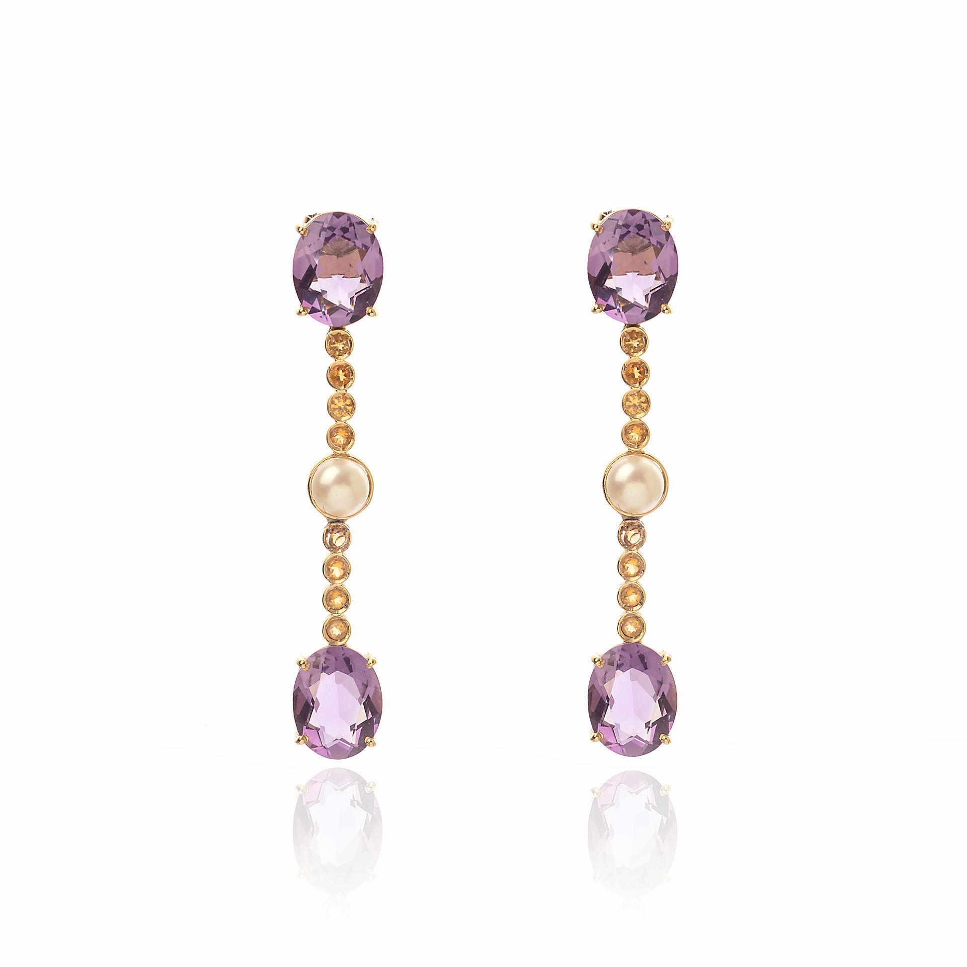 Brinco Longo em Ouro Amarelo com Ametista, Citrino e Pérolas — uma joia que une sofisticação, brilho e personalidade da nossa coleção Fiji. Com uma Ametista de 7,85ct, iluminada pelo toque vibrante do Citrino 0,23ct e finalizada pela delicadeza das pérolas, no ouro Amarelo, este brinco cria uma harmonia de cores que chama atenção pela elegância única.