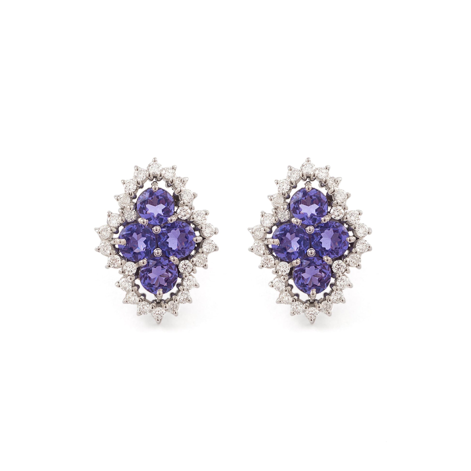 A joia é um design de Tanzanitas (3,09cts) e Diamantes (1,04cts) em ouro branco.