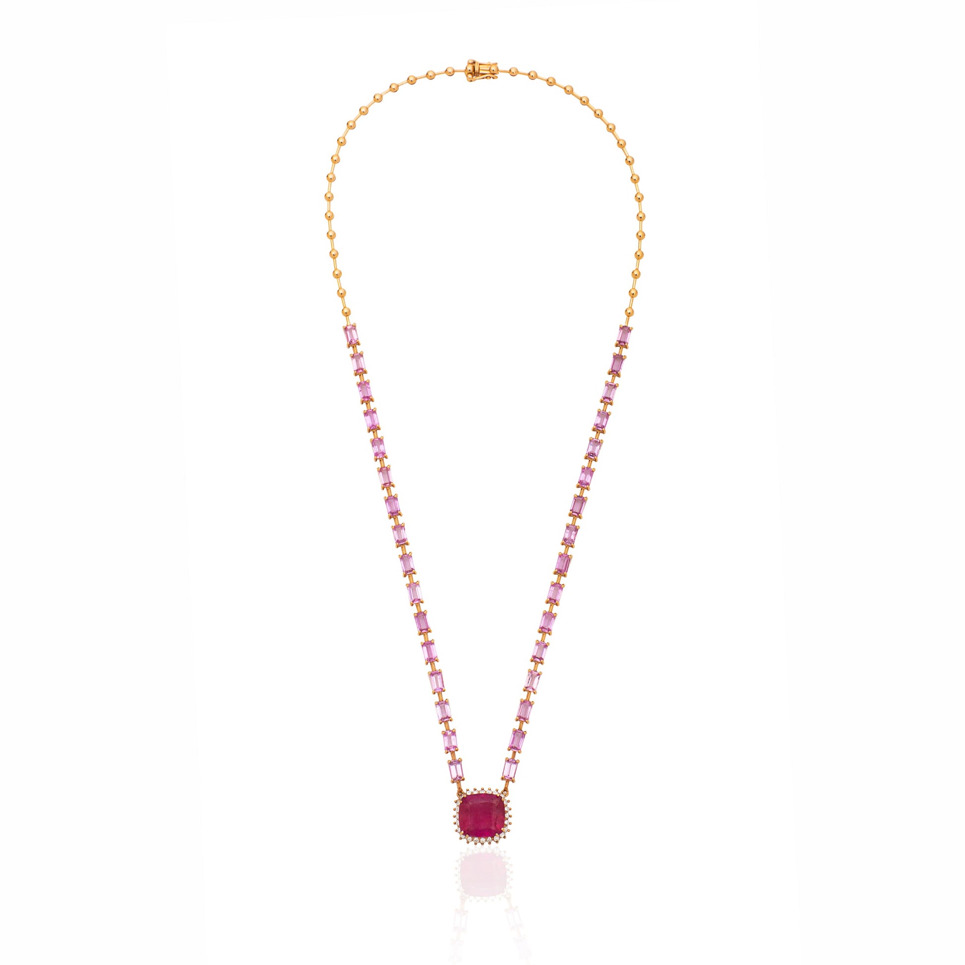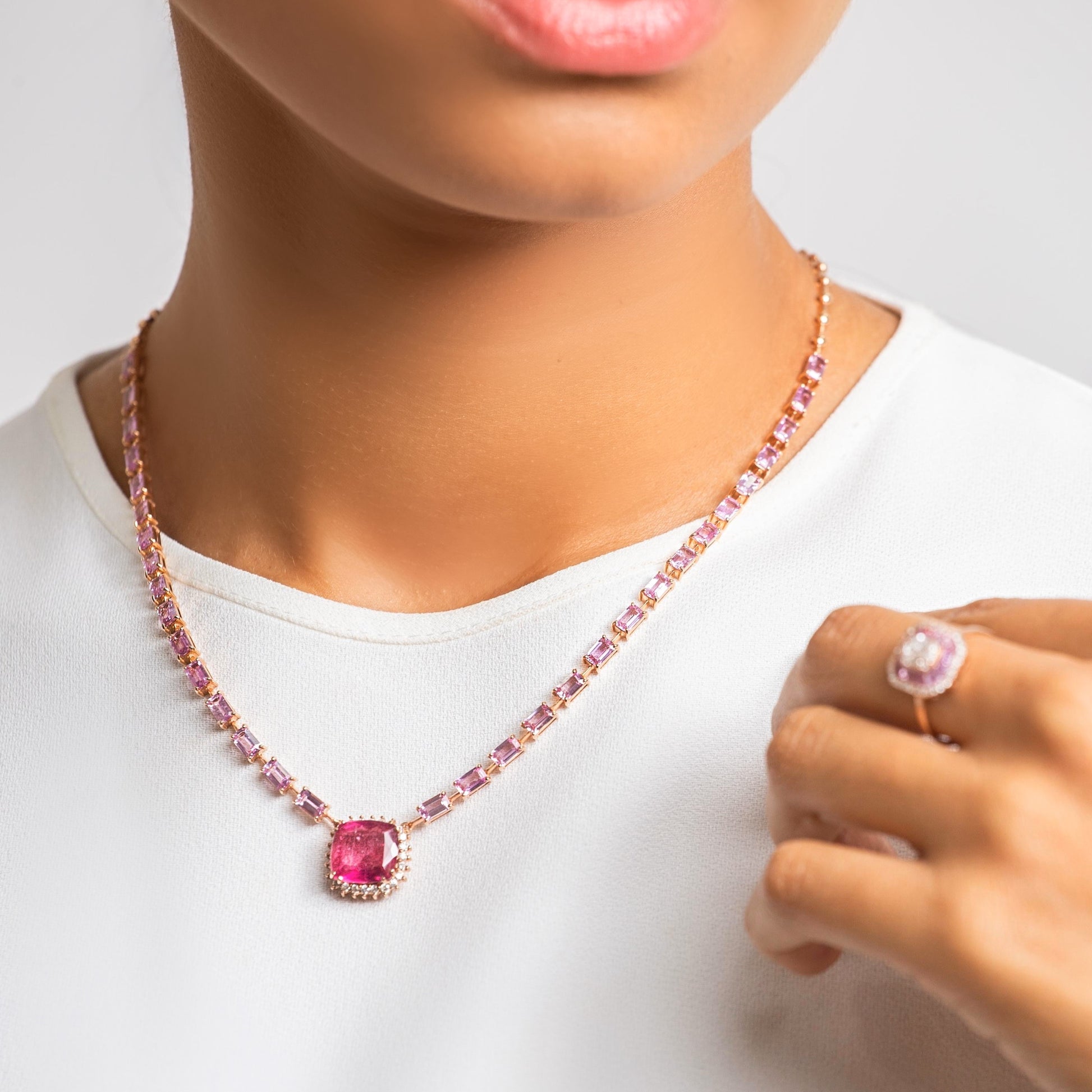 O Colar Baile representa uma celebração da vida em sofisticação e verdade, por meio de safiras rosas (7.34 ct) e rubelitas (4.4 ct) com diamantes (0.38 ct).