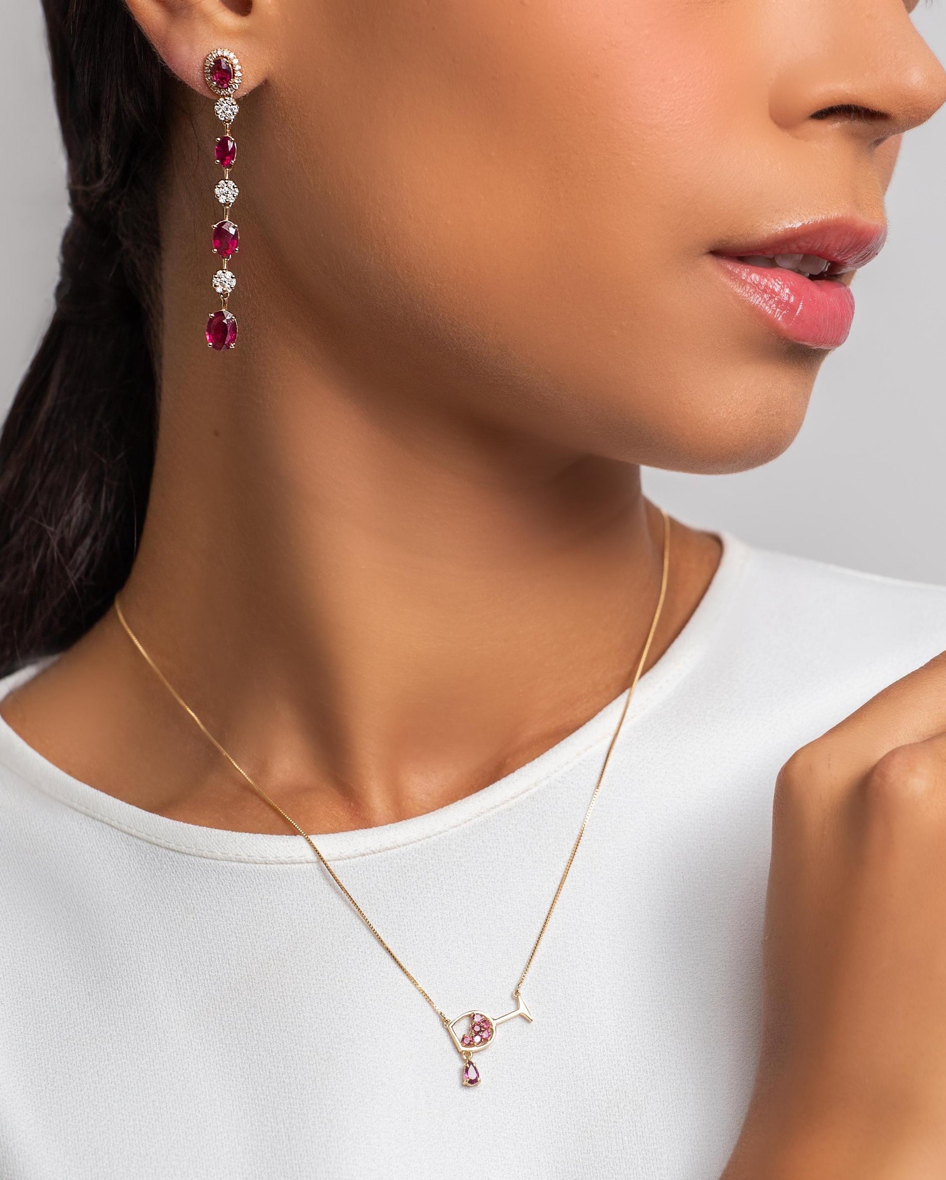 O Colar Wine representa a coleção de lançamento do vinho Dassa Danna e de momentos especiais de celebração, através do design em ouro amarelo com detalhes em rodolitas.